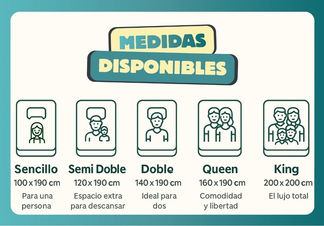 Sencillo (100x190 cm), Semi Doble (120x190 cm), Doble (140x190 cm), Queen (160x190 cm) y King (200x200 cm).