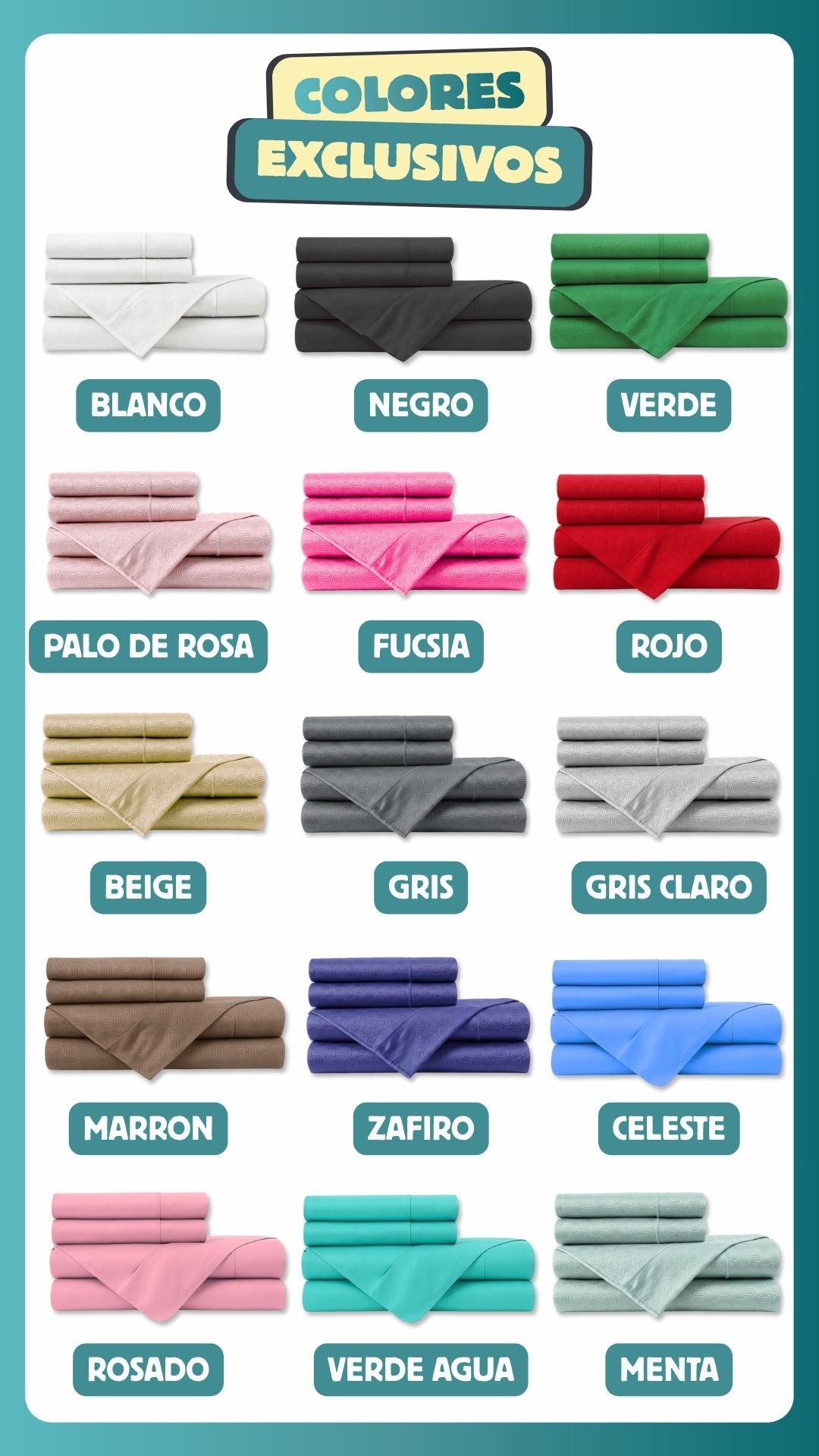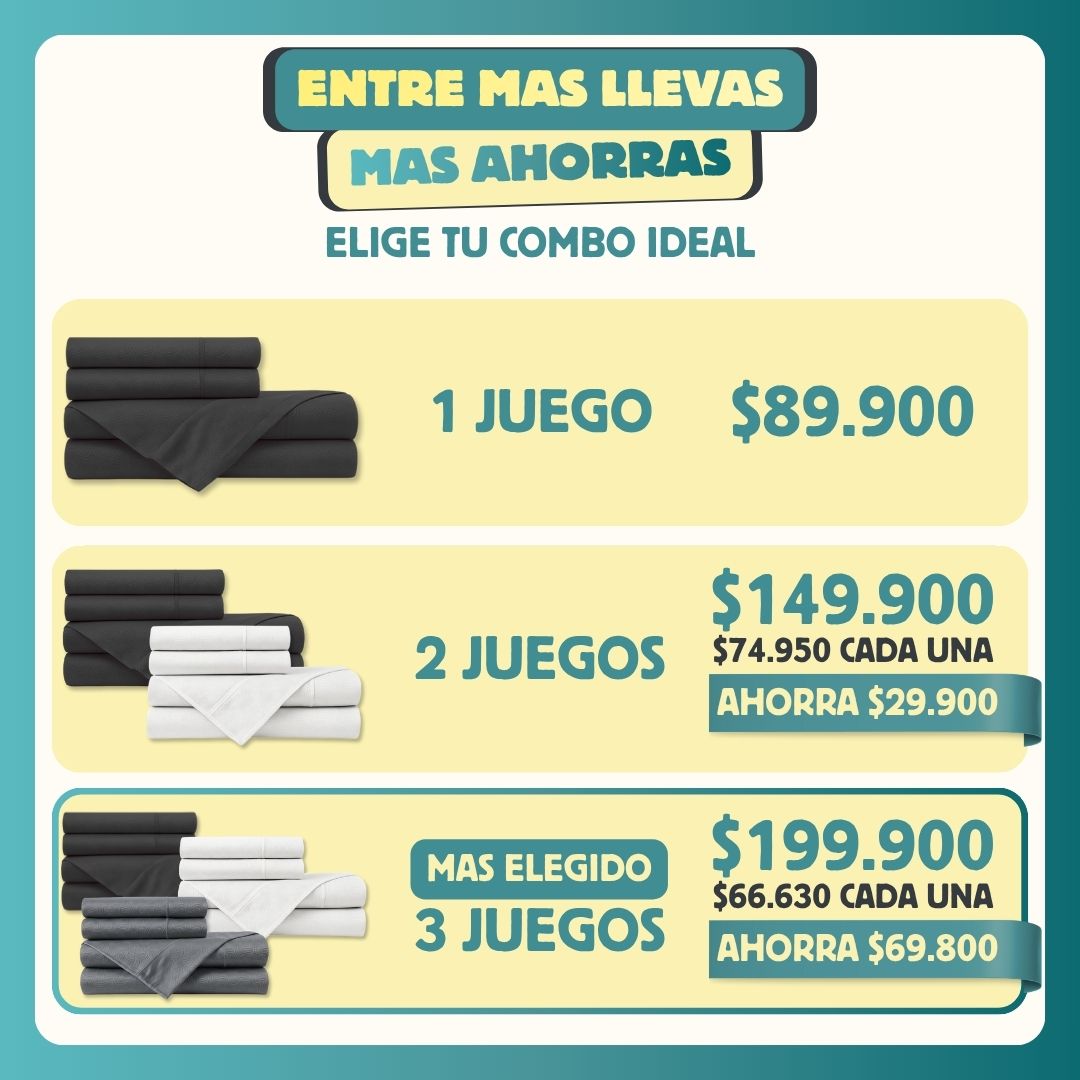 Cada juego trae 1 sábana ajustable, 1 sábana plana y 2 fundas para almohada. Todo en el mismo color y con costuras reforzadas.